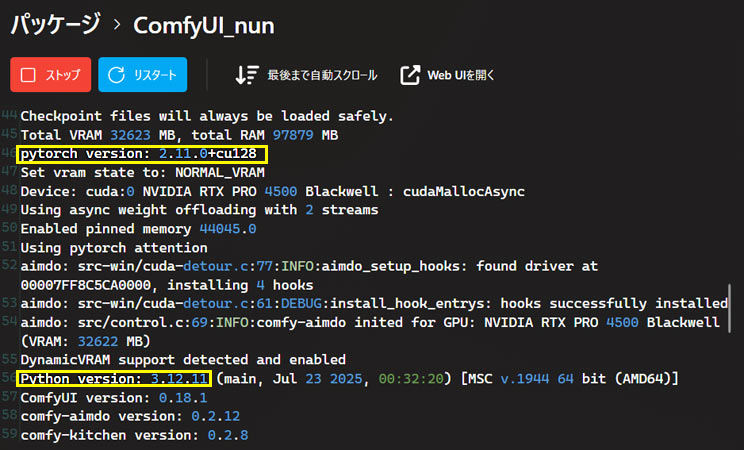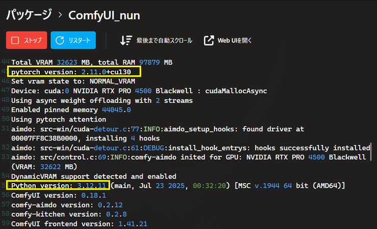私の環境では「pytorch version: 2.11.0+cu130、Python version: 3.12.11」。