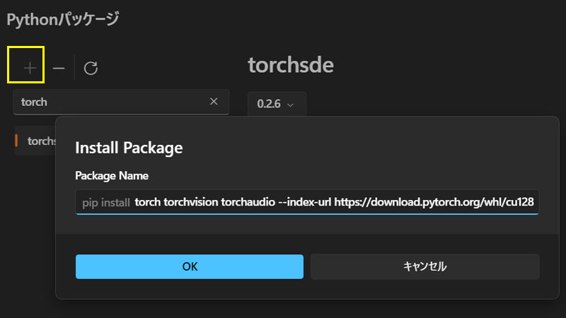 次にCUDA 12.8版を再インストールします。今度は「+」ボタンを押して、Install packageから以下のコマンドをpip install 以降をコピペしてください。