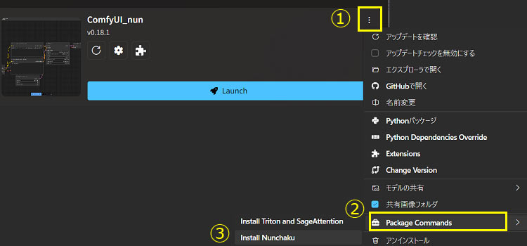 Stability Matrixのcomfyui起動前画面の「…」から「package commands」から「Install Nunchaku」を選んで自動インストールできます。事前準備が済んでいるので、(2026年3月26日時点では)すんなりとインストールできました。