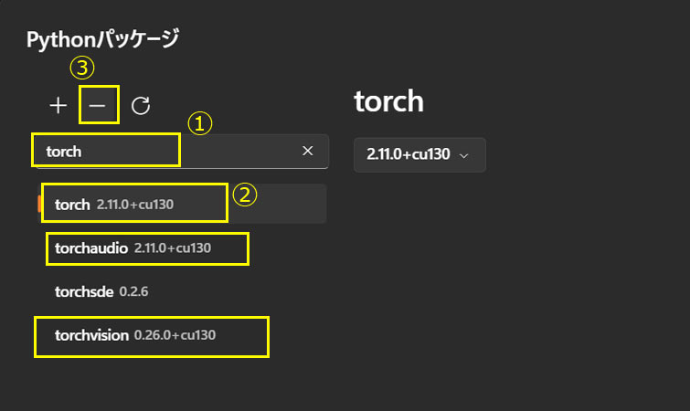 「torch」「torchvision」「torchaudio」をそれぞれ名前リストから選び、「-」ボタンから、3つアンインストール(削除)を行います。削除するものは完全一致名のものだけです。+cu130と表示があります。
