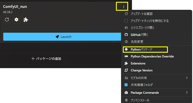 Stability Matrixのcomfyui起動前画面の「…」から「pytorchパッケージ」を選ぶ。