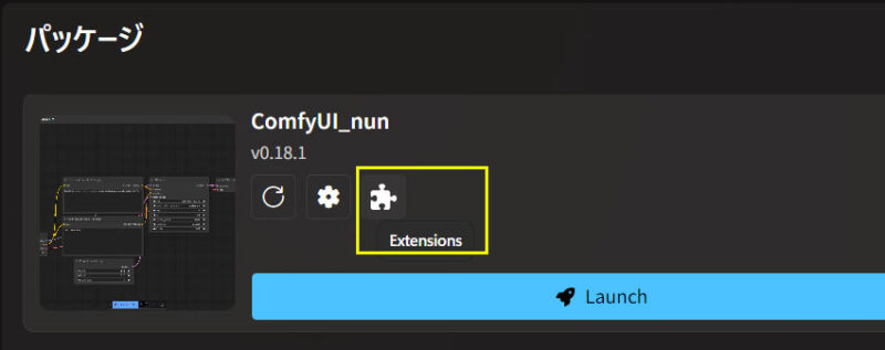 先ほどインストールした新規ComfyUIを(launch)起動します。ComfyUIバージョン0.18.x以降を使用の場合は、追加のComfyUI-managerのインストールは省略できます。(ComfyUIバージョン0.18x以前の場合は、パズルアイコンextensionを選んで、ComfyUI-managerをインストールする必要あり)