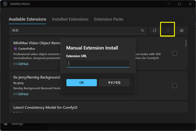 Stability Matrixのcomfyui起動前画面のパズルアイコン(extensions)を起動し、「+」ボタンを選ぶ。