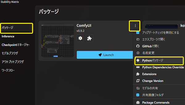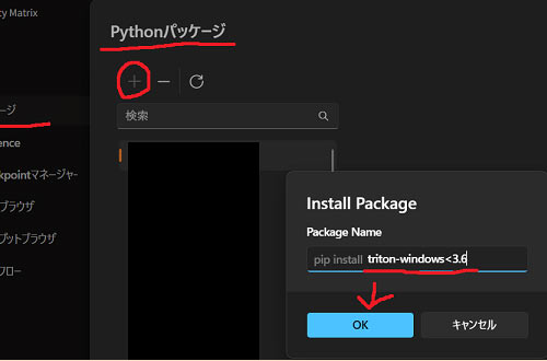 「Stability Matrix」の場合は、ComfyUIパッケージ一覧画面の縦3点マークの(…)より、メニュー「Pythonパッケージ」を選択し、表示されたウィンドウ内の(+)ボタンから行える「INSTALL Package」から導入できます。