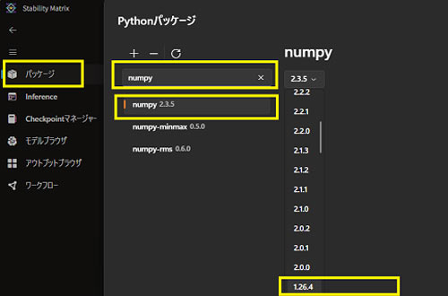 「Stability Matrix」の場合は、ComfyUIパッケージ一覧画面の縦3点マークの(…)より、メニュー「Pythonパッケージ」を選択し、表示されたウィンドウ内の検索欄に「numpy」 と入れて、リストから「NumPy」 を選択。