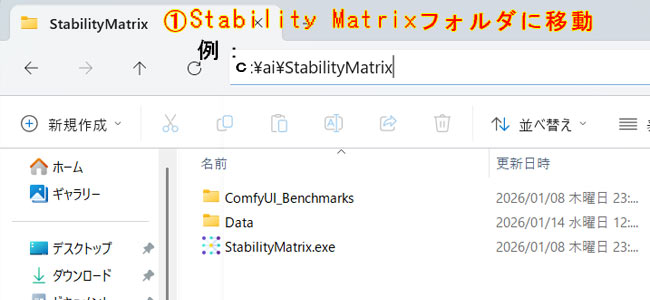 Stability Matrix のインストール先のフォルダに移動する。インストールした「ComfyUI」フォルダを「エクスプローラー」などで開く。