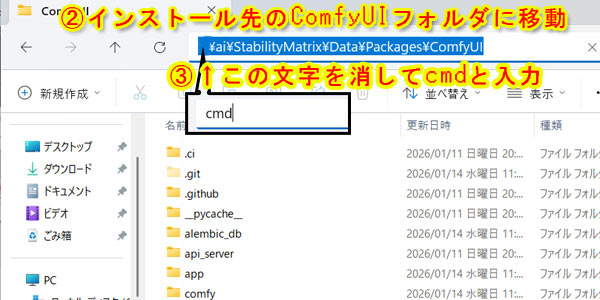 ComfyUI フォルダに移動後、「cmd」 で、以下のコマンドプロンプト入力。